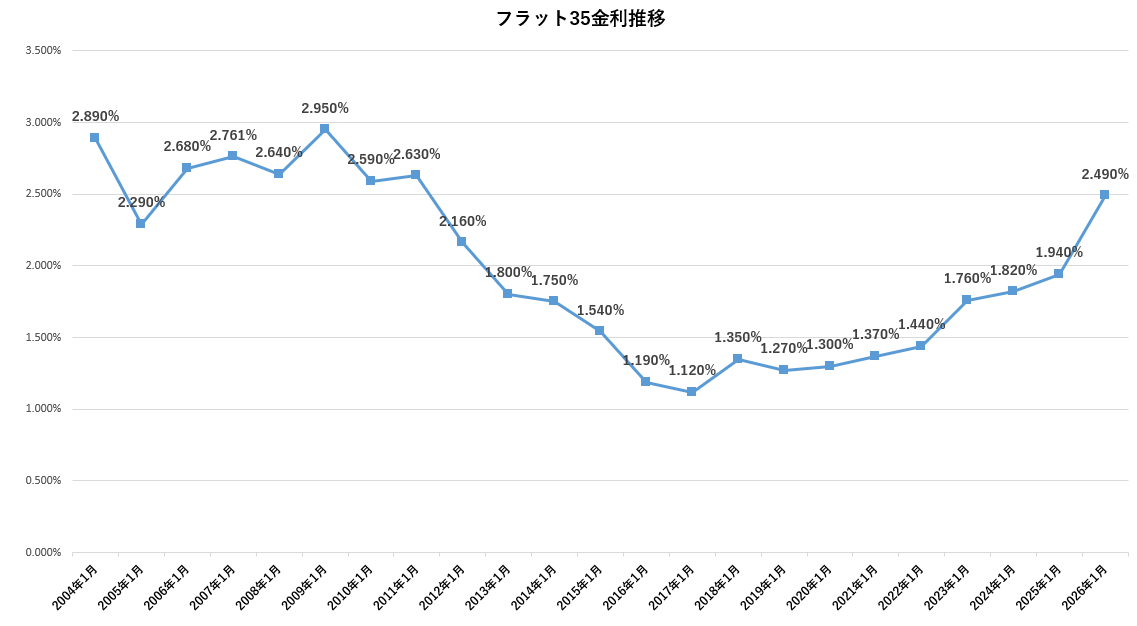 フラット35は、2003年10月に前身の住宅金融公庫(現在は住宅金融支援機構)が取り扱いを始めました。制度開始当初、フラット35の最低金利は3%前後で推移しましたが、景気減速懸念などから長期金利が低下したことに伴い、2004年12月に2%台前半まで低下しました。