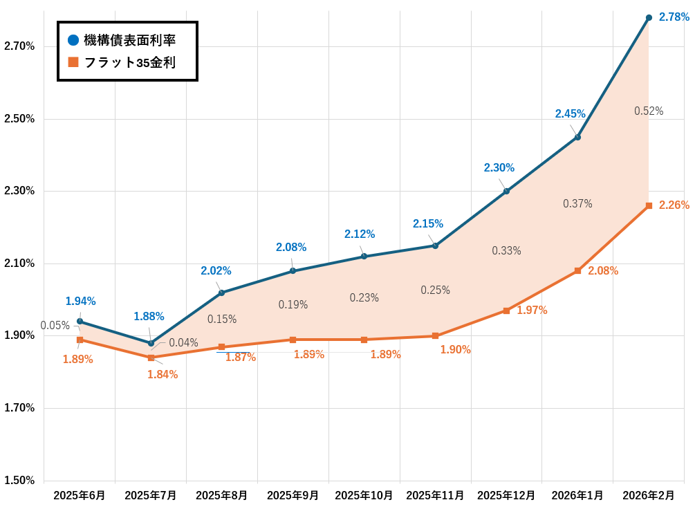 金利上昇の背景として、2月は新発10年国債利回りが0.33ポイント上昇し、それに伴い機構債の表面利率も0.33ポイント上昇したことが挙げられます。これに対し、【フラット35】の金利上昇は引き続き抑えられている状況です。