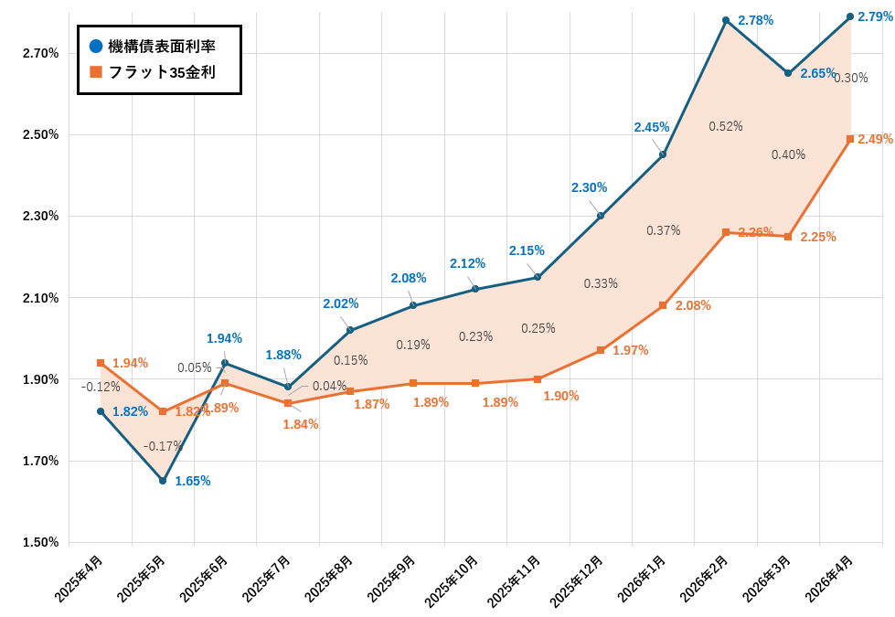 2026年4月から5月にかけて、新発10年国債利回りは2.24%から2.42%(※)へ、0.18ポイントの大幅な上昇となりました。これに伴い、機構債の表面利率は2.79%から2.97%へと0.18ポイント上がっています。単純計算すれば、5月の【フラット35】も同程度の0.18ポイント上がる計算となります。